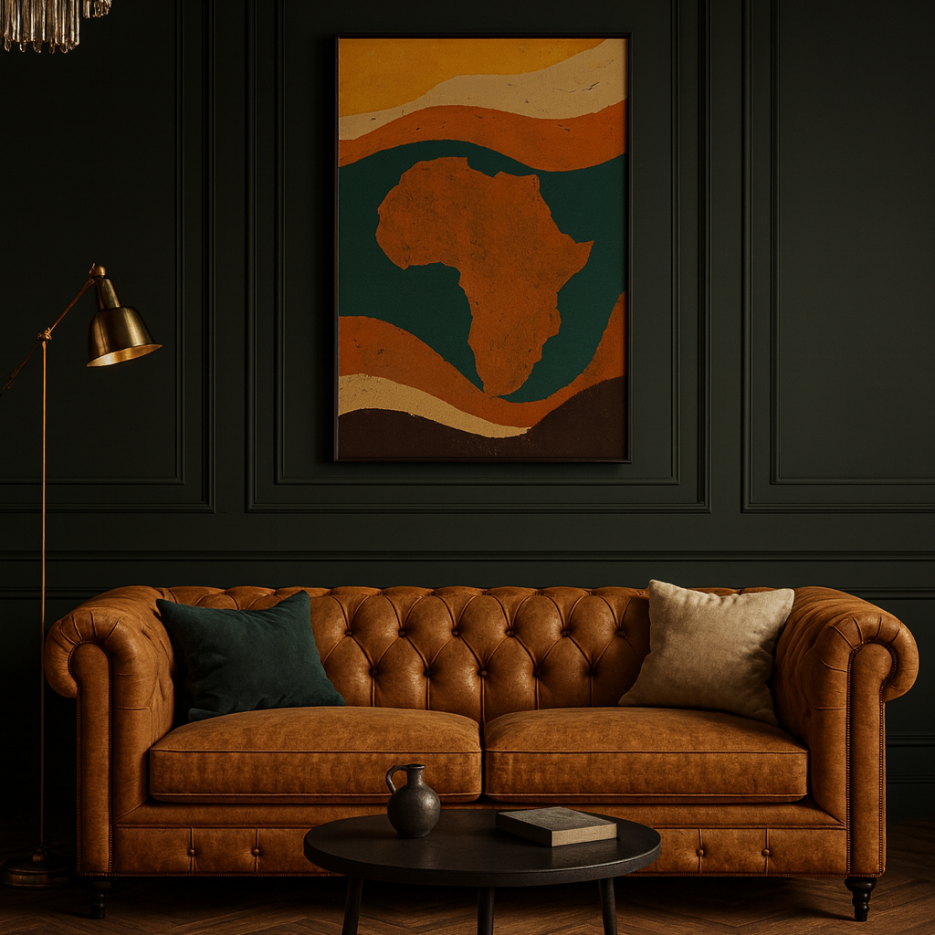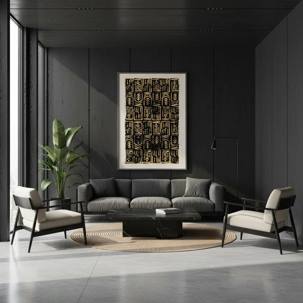 The most compelling interiors we are currently working with use contrast as a design tool. A paired-back, neutral-toned room given one bold, narrative-rich work Kutshona Ilanga by Rix, with its rich palette and cultural depth, against an otherwise restrained wall, is a brief we have placed more than once this year. The contrast does not create tension. It creates authority. Similarly, a maximalist salon hang almost always benefits from one piece of radical stillness within it, a work whose quiet creates a visual breath that makes the surrounding energy more electric. Ligraphy on Gold by Five46, our current mixed media original soon to be vaulted, plays this role with precision: the bold calligraphic forms on textured gold are visually complex enough to hold their own in a layered interior, yet the discipline of the mark-making gives it a stillness that the room around it can lean into.